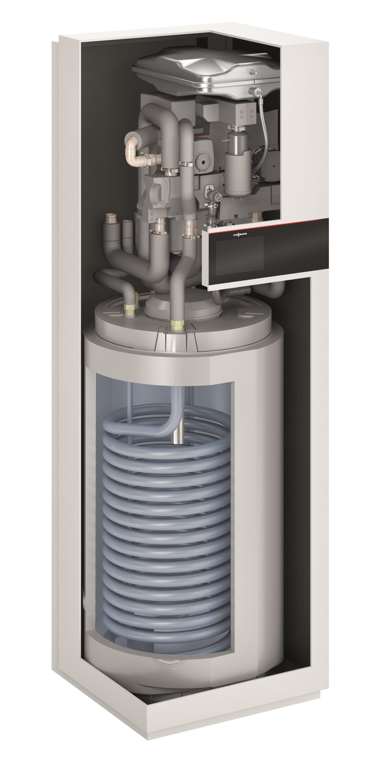 Image – The Viessmann Vitocal 151-A air source heat pump with integral 190-litre DHW cylinder – cutaway of the indoor unit.